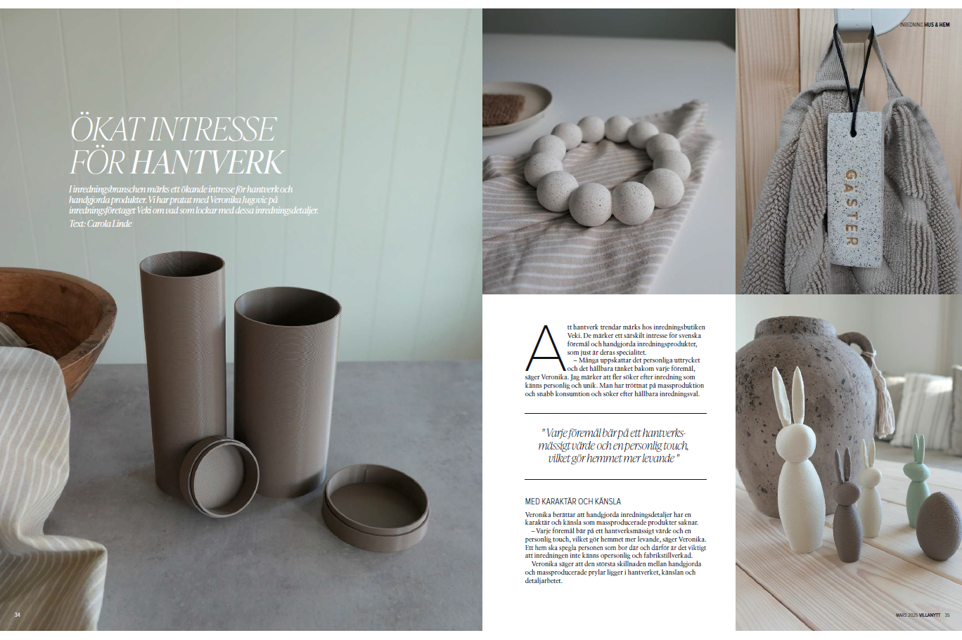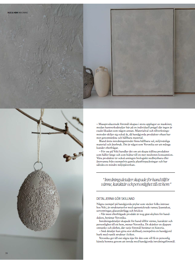 VEKI har även uppmärksammats i tidningen VillaNytt i ett reportage om handgjorda inredningsdetaljer och den växande trenden för svenskt hantverk. Du kan ta del av reportaget längre ner på sidan.